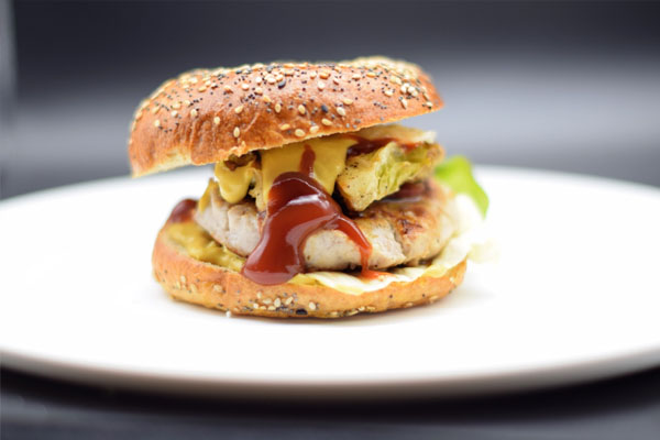 Panino con hambuger di coniglio, foglie di radicchio verza e speck arrostiti, scaglie di parmigiano, senape e ketchup