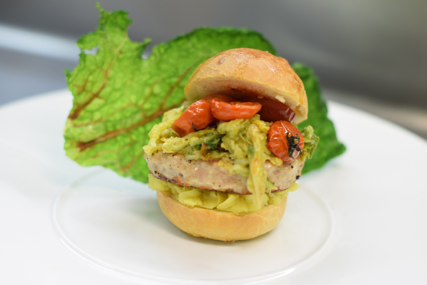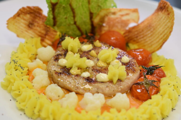 Hamburger di coniglio con purè alla curcuma, cavolfiore, crema di zucca e pomodori confit