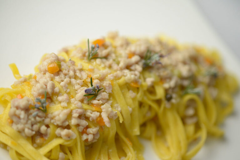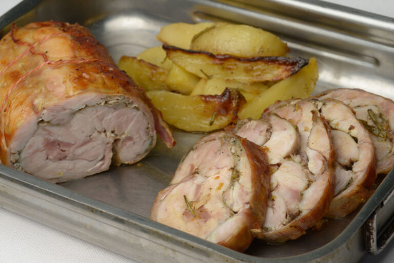 Carne di coniglio arrotolata con pancetta di maiale stagionata, finocchietto selvatico fresco (o essiccato nel caso di fuori stagione) ed aromi vari.